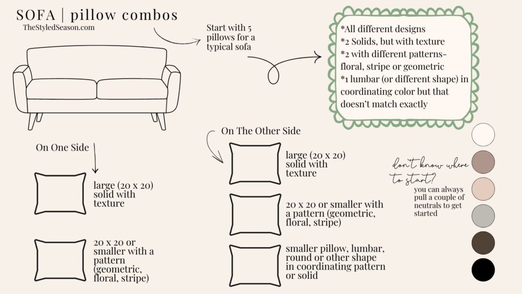 You know that perfectly styled sofa or bed where all the pillows just work — the patterns, the colors? For years, I would buy my pillows without much thought other than a color and be disappointed when they wouldn’t look like a magazine. Now, it seems so obvious where I went wrong. I never thought about styling my pillows together. I would just buy them as I saw and be surprised that nothing looked cohesive when I was done. I spent so much money picking the wrong ones too. So, now I’m much more intentional. There are tons of “right ways” to style your sofa, these are just some easy things to try and a jumping off spot to finally get it right (I’m talking to myself here, LOL). I started using this below, (first on just a notepad, then I moved over to Canva).